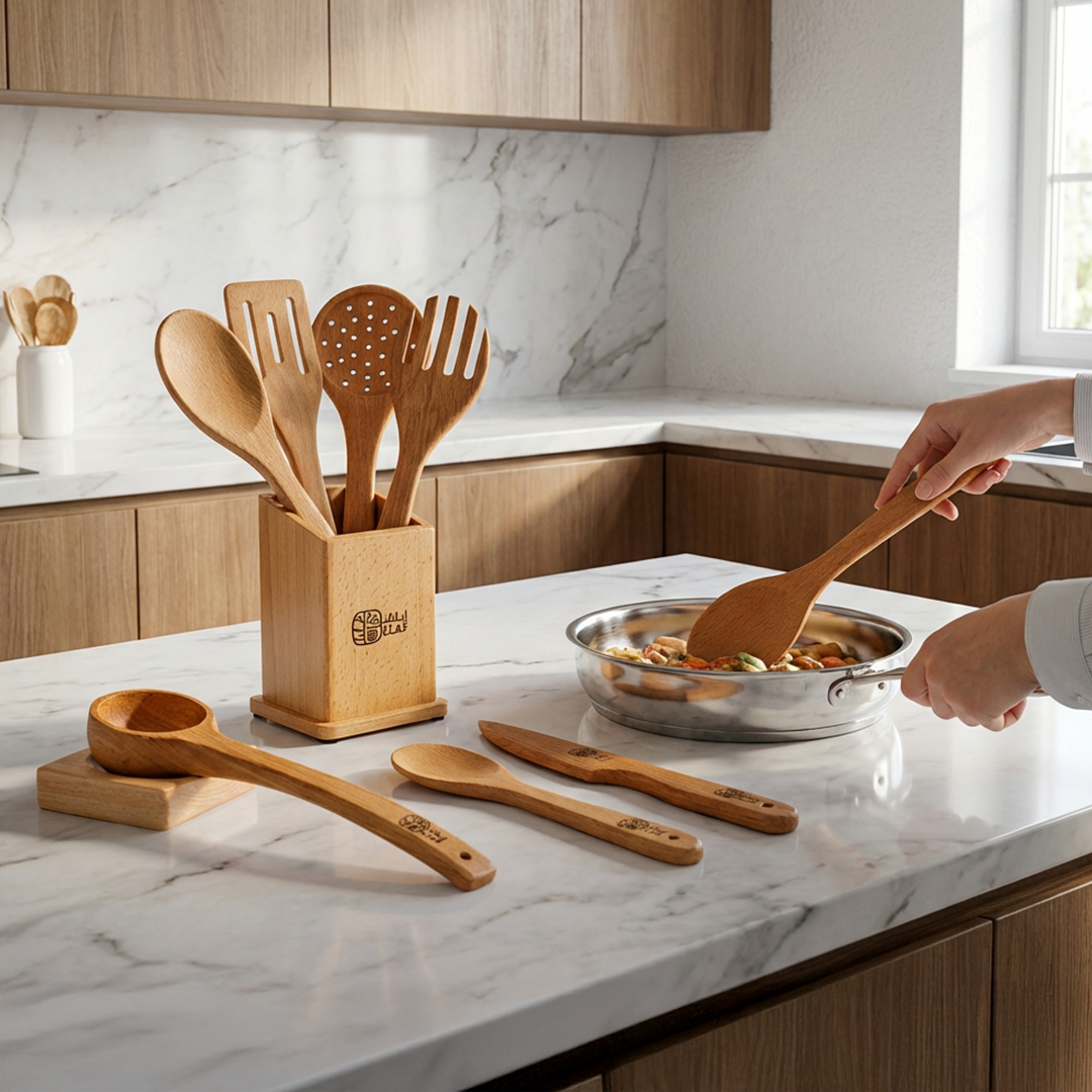 حافظي علي قدورك من الخدش وصحة أسرتك من المواد الضارة واستخدمي طقم الملاعق الخشبية الطبيعي… أمان، شكل راقي، وعمر طويل
